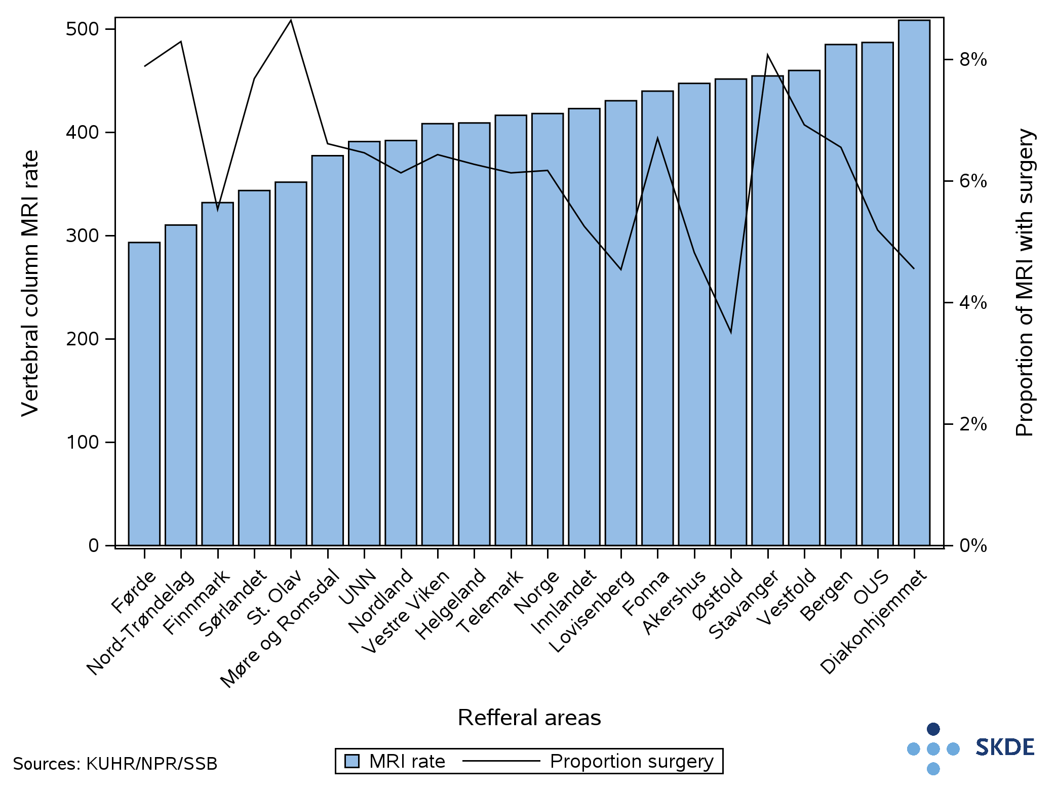 There was, on the other hand, large geographic variation in the use of x-ray of the lumbar spine prior to and following the MRI. MRI of the lumbar spine will often be the preferred diagnostic test, and the use of x-rays of the lumbar spine is therefore decreasing. Possible explanations can be access to MRI machines, preferences or differences in indications. However, the majority of the variation is more likely due to differences in treatment practices.